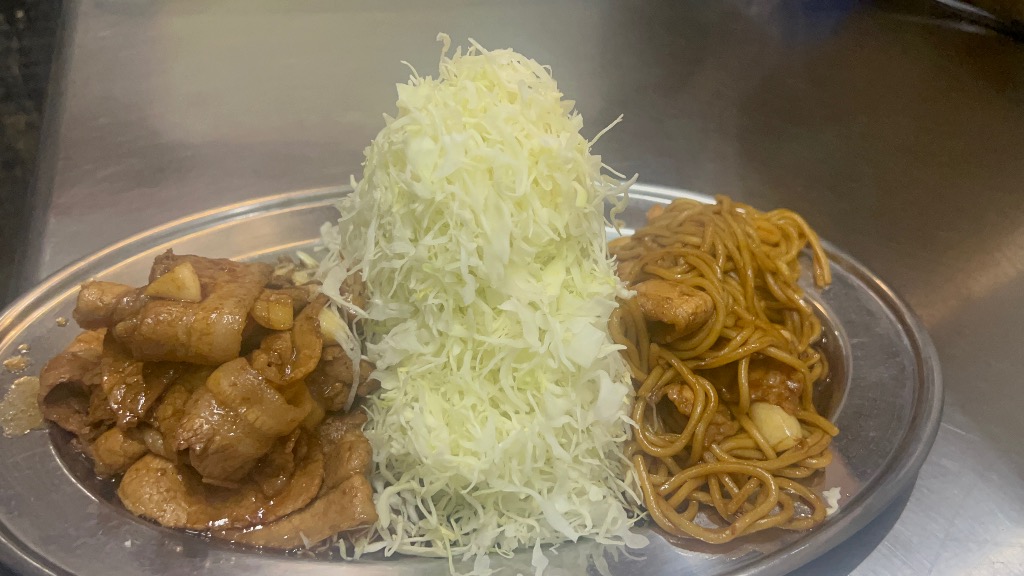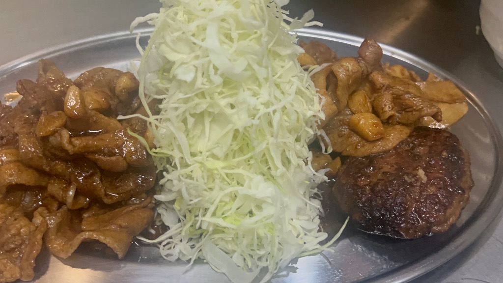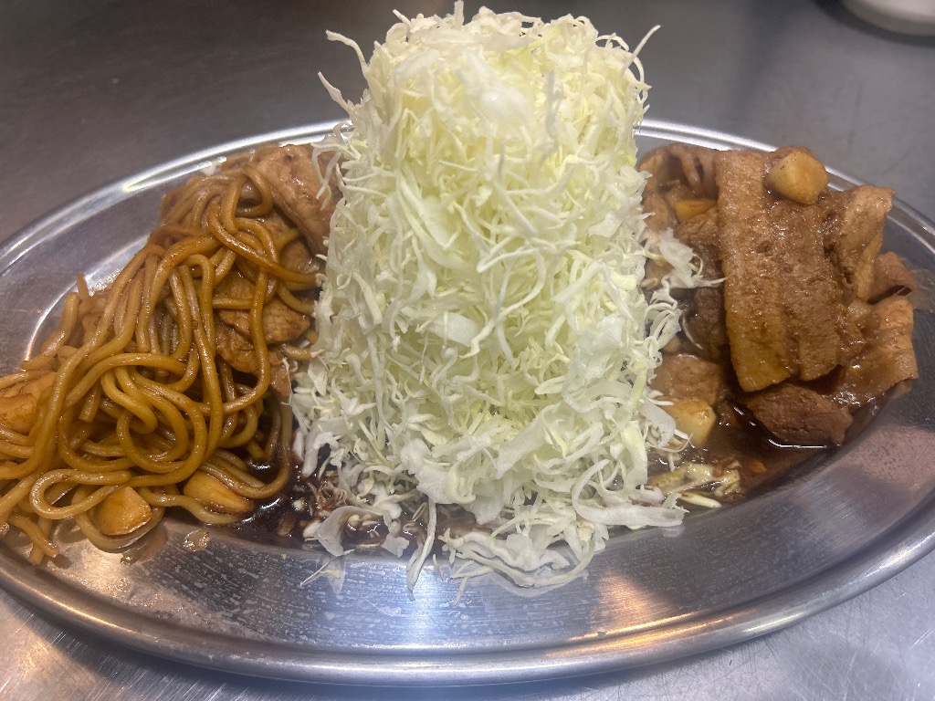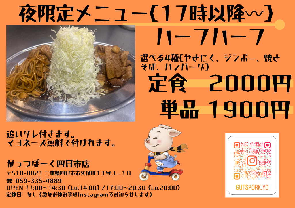 4月12日スタート夜限定メニューとしてデビューハーフハーフ選べる4種、やきにく、焼きそば、ジンポー、ハンバーグから2種をえらんでいただけます。追いタレ付き、マヨネーズもお付けできます。新しいがっつりメニューとしてご賞味くださいませ。