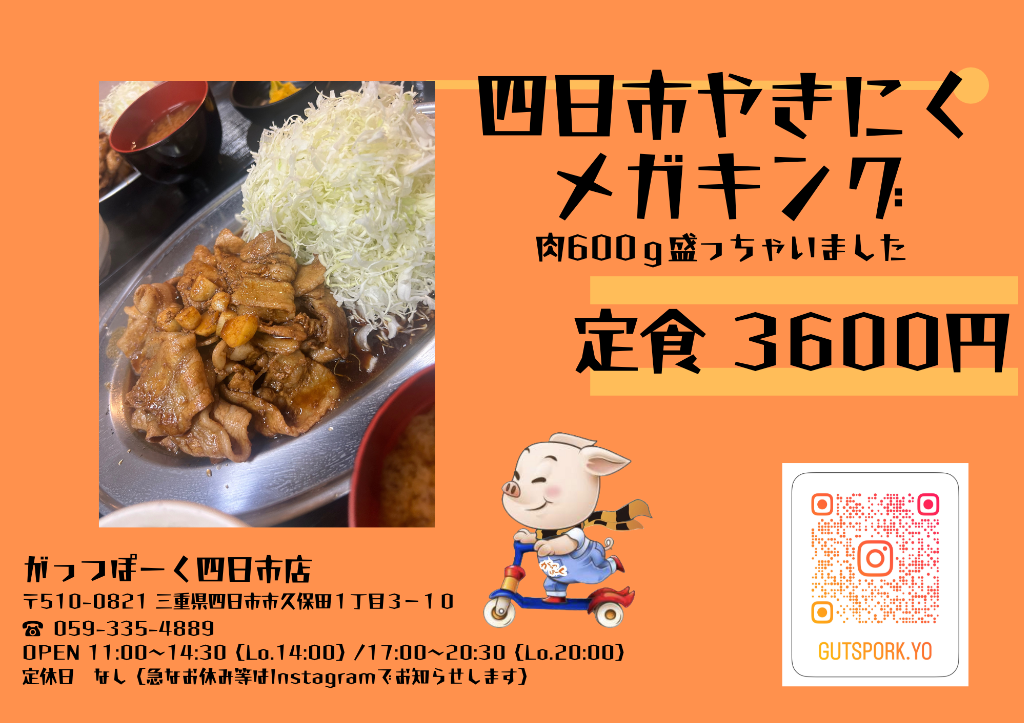 四日市やきにくメガキングサイズデビュー肉600g 3600円(税込)ウーバーイーツ、出前館で先行デビューして好評をいただいており、店内メニューに追加しました。どうぞチャレンジくださいませ。団体でシェアもよきですよ。