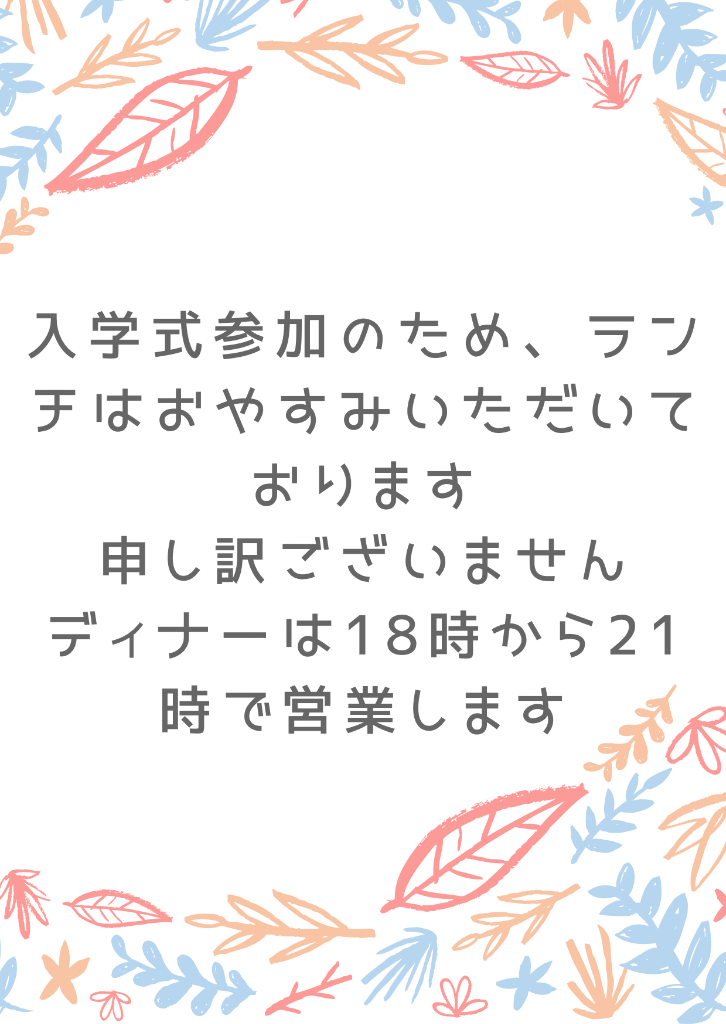 4月9日水曜日はランチはお休みいただきます。ディナーは17時から店内営業、UberEATS、出前館でオーダーできます。何卒よろしくお願い申し上げます。