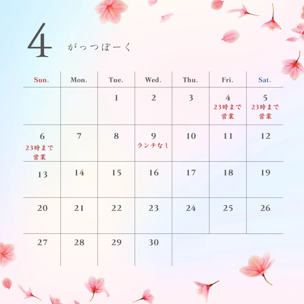 4月スケジュール確定です。4月も定休日はなし。9日はランチはなしのディナー営業のみ4.5.6日はディナーは23時までの延長営業3月、4月から転勤で四日市にお越しのお客様が来店増加中。