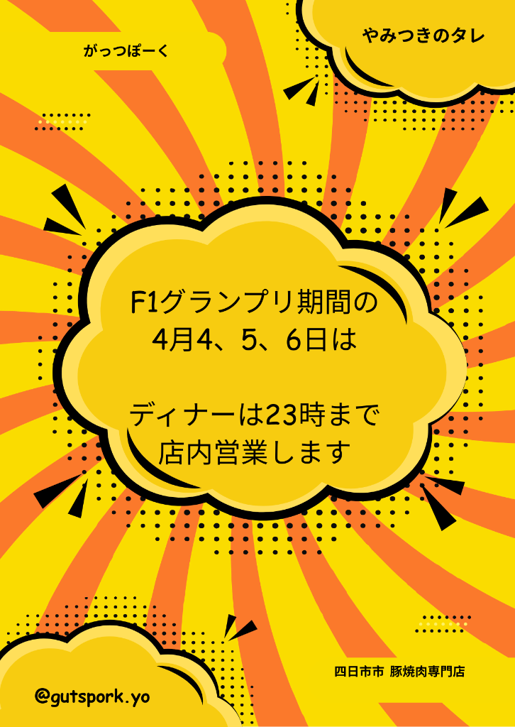 4月4.5.6日は店内営業を11時から14時半、17時から23時でディナーを延長営業させて頂きます。F1グランプリ開催期間のため、少しでも県外、県内のお客様のごはんどころを提供したいため。御来店お待ちしております。