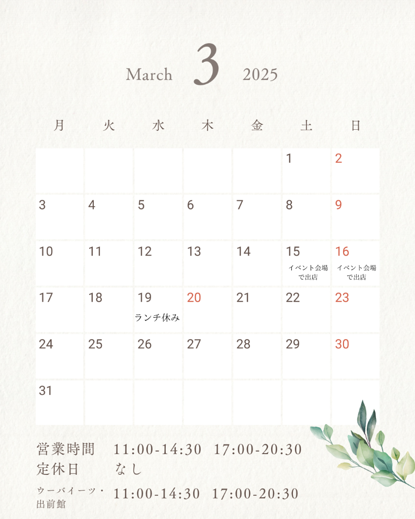 超最速3月のスケジュールです。15.16日はイベント出店予定です。19日はランチはお休みいただきます。三月もお客様にさらにさらに寄り添って、がむしゃらに営業していきます。あっ、まだ、二月二月。。二月もたくさんのご来店ありがとうございます