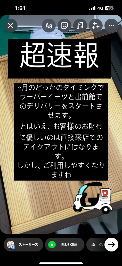 超速報2月上旬にはウーバーイーツ、出前館できるように今、動いております。さらに当店をご利用しやすくなります。どうぞお待ちくださいませ。ヤミツキになるタレが魅力の当店を1度、ご利用くださいませ