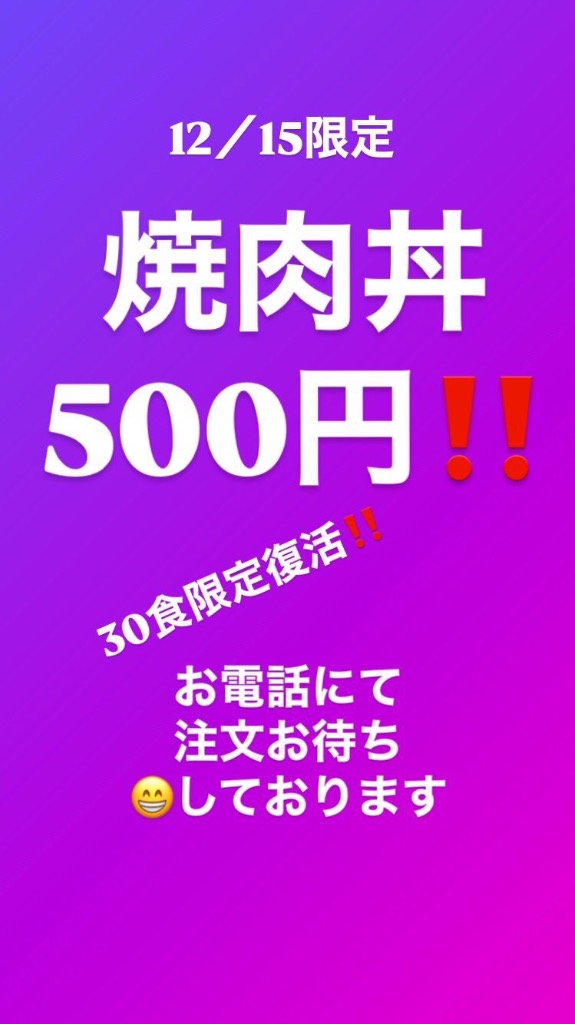 豚肉の小間切れの部位を使って久しぶりに焼肉丼税込500円を30食限定でテイクアウト限定開催しかも12月15日の1日のみで開催します。もちろんタレはがっつぽーくのタレです!この機会に是非ご利用くださいませ。DM、店舗へ電話、来店でぜひ来店の場合、少し時間いただく可能性がございます。
