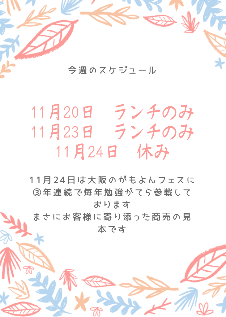 今週のスケジュールです。12月のスケジュールはもうしばらくお待ちください。年末年始は可能な限り、営業し、寒い冬にエネルギーチャージをお届けできたらと考えております。忘年会、新年会など、貸切も受付ておりますので、お気軽にお問い合わせくださいませ。