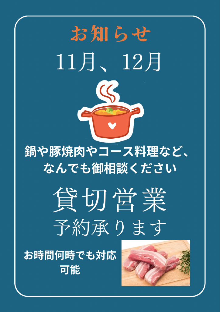 11月、12月は忘年會や打ち上げ會などでのご利用がしやすいように、通常の料理メニュー以外での料理(鍋やコース料理やアラカルトなど)で宴會を予算に応じてしていただくことも可能です。ランチタイムでもディナータイムでも場合によっては時間外もご利用可能です。なんでも1度、お店に御相談くださいませ(⁎ᴗ͈ˬᴗ͈⁎)
