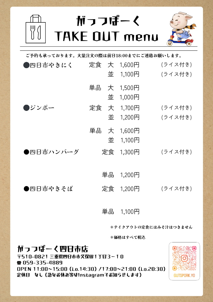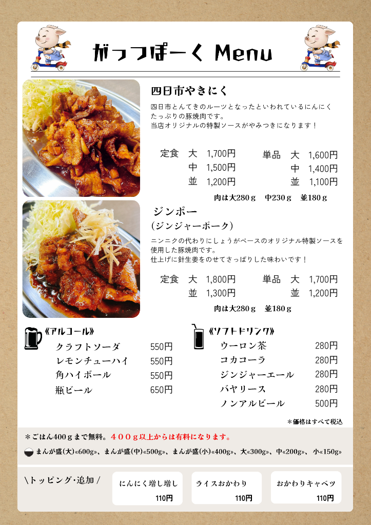 de_nakatake がっつぽーくは地域に愛される飲食店を目指し、がっつり安価でおなかいっぱいたべれるをモットーにでの価格で召し上がって頂けるよう努力を続けてました。しかし、お米や調味料、豚肉の原材料高騰により現行価格でのご提供が非常に厳しい状況です。ご利用いただいている皆様には、大変心苦しくご迷惑をおかけしますが、10月8日よりお価格改定をさせて頂きます。今後も皆様に愛されるよう、サービス向上に努めて参ります所存ですので、変わらぬご愛顧の程、お願い申し上げます。