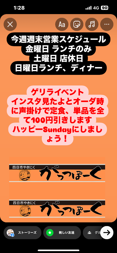 10月4日金曜日はランチのみ10月5日土曜日はおやすみとさせていただきます。よろしくお願い申し上げます10月6日ゲリライベントとしてオーダ時にインスタ見たよとで定食、単品が全て100円引きさせていただきます。