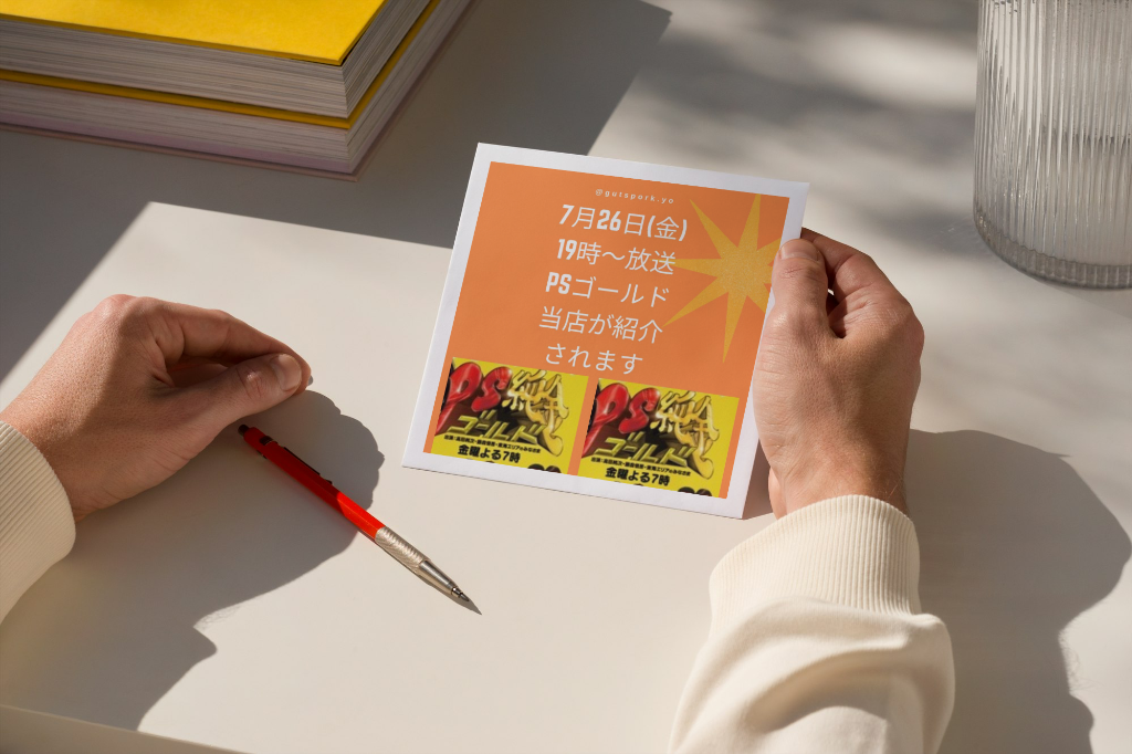 いつもご来店ありがとうございます。7月26日金曜日19時からがっつぽーくの店舗がテレビ放送にて紹介されます。中京テレビ PS純金(ゴールド)ひとえにお客様が支えてくださっていることで、こうして営業させていただいております。感謝申し上げます。お席は事前に電話にて予約できます。テイクアウトもできます。どうぞご利用くださいませ。