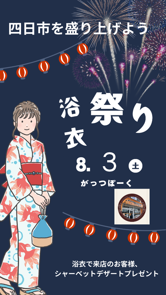 四日市のお祭りに合わせて四日市を盛り上げよう浴衣を着て来店のお客様にシャーベットデザートをプレゼントさせていただきます。がっつり豚焼肉定食を食べた後につめたーいシャーベットをささやかではありますが、お楽しみくださいませ