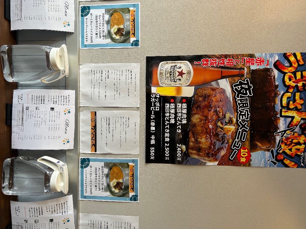 メニューは四日市やきにく、ジンポー、四日市酢豚、単品でも定食でも可。ただし定食には味噌汁はつきません。ご了承ください。おすすめは何といってもジンポーでございます。にんにく抜きでご用意しております。ランチタイム、ディナータイム(居酒屋タイム)のどちらでもご利用可能です。ほかには四日市やきにく丼、新メニューでぽーくカレー、合い盛りカレーがございます。一度、ご賞味くださいませ。